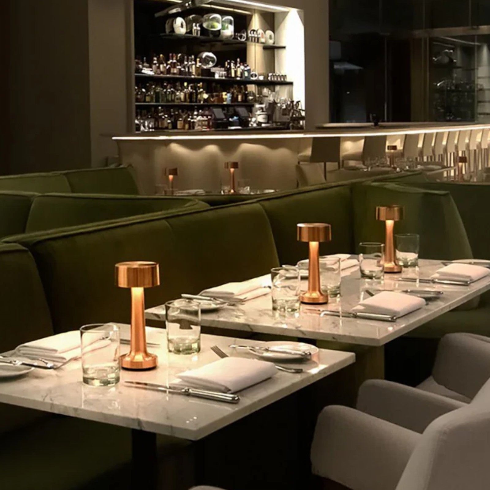This compact LED table lamp features a modern design with a gold stainless steel finish and a minimal footprint. A touch dimmer lets you set shadow-free light for a warm, welcoming ambience, while the rechargeable build supports flexible, wire-free placement.